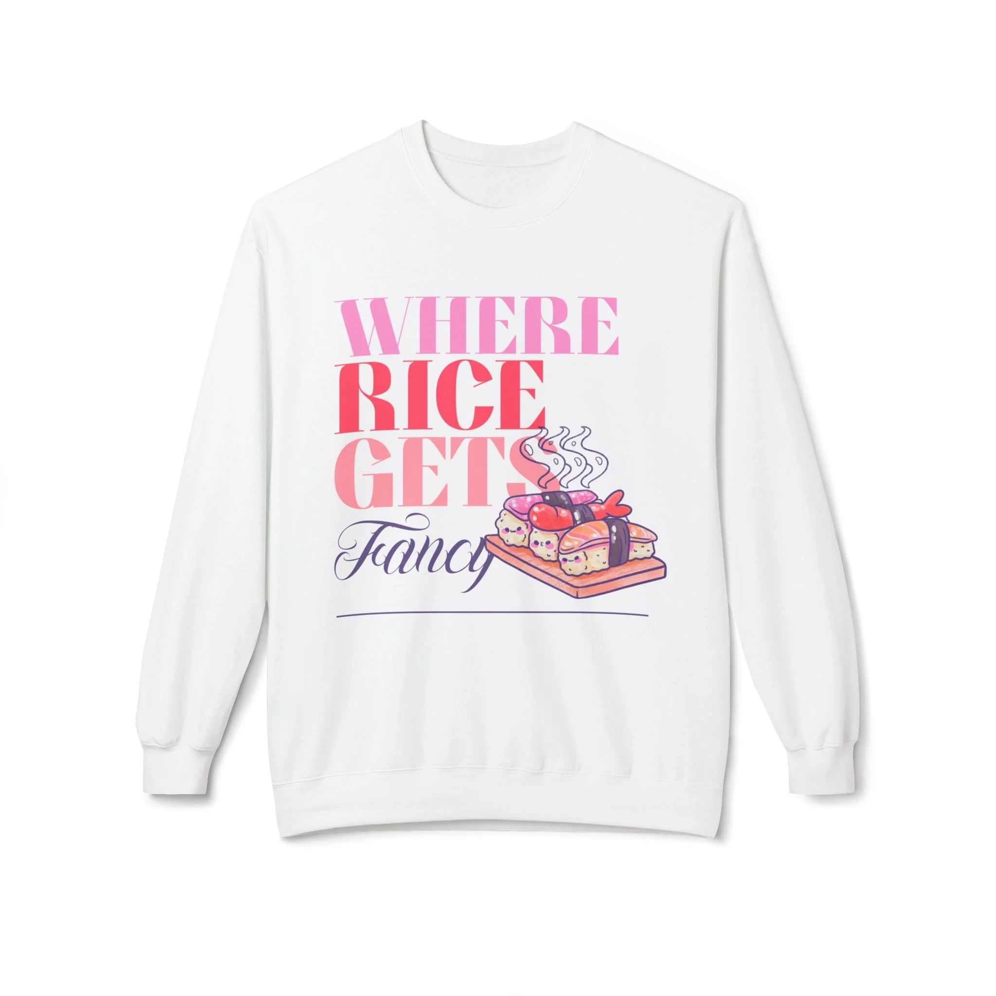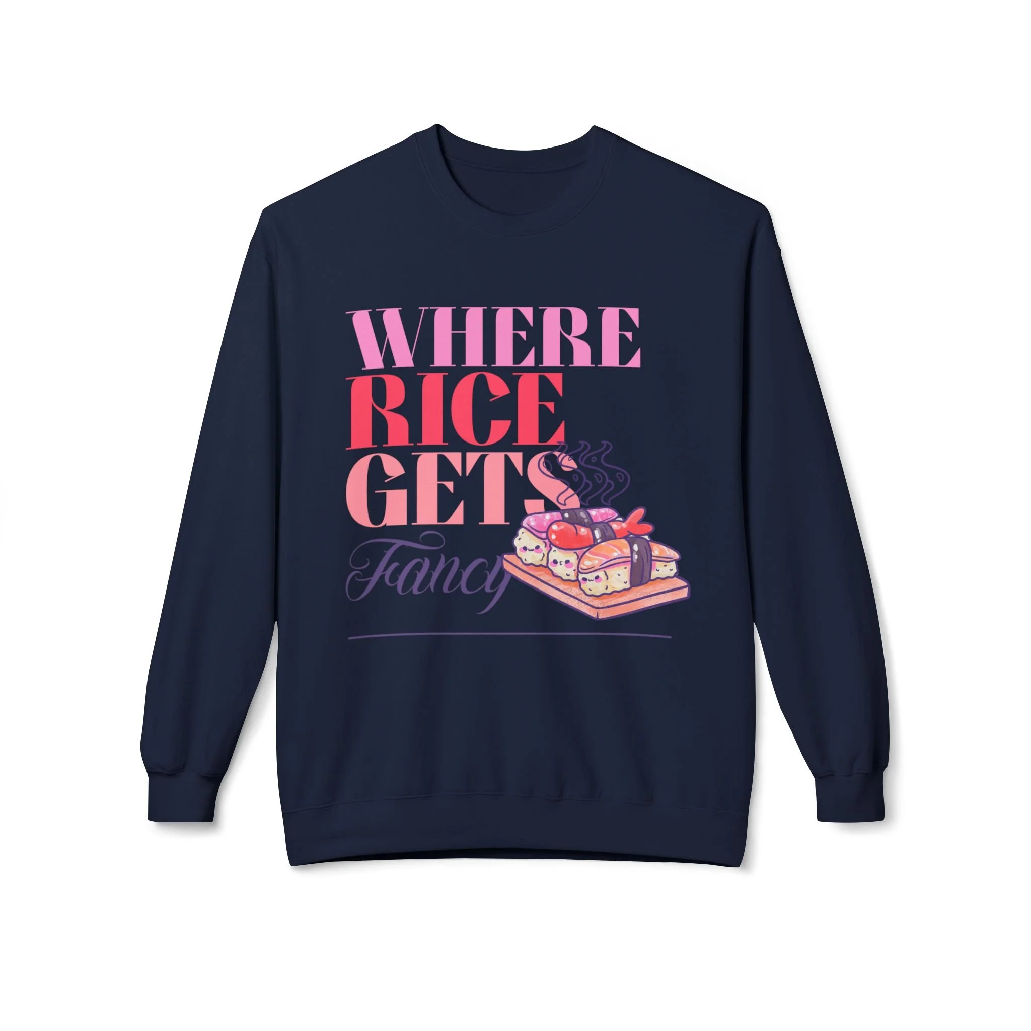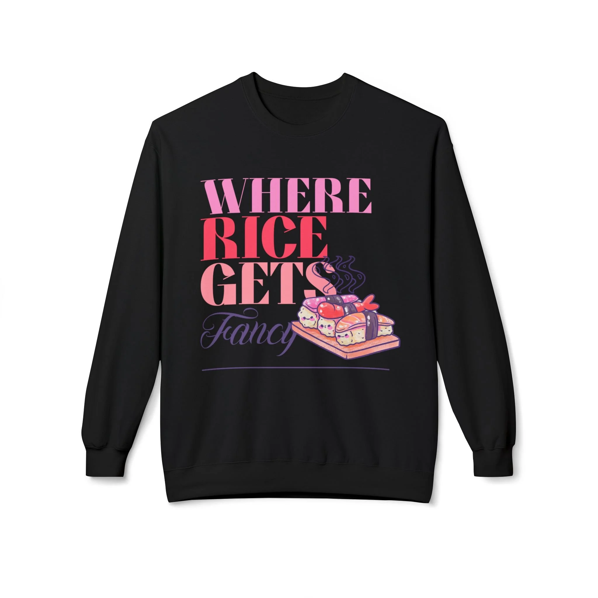 Cute and Happy Sushi on Bamboo Tray - "Where Rice Gets Fancy" Crewneck Sweater