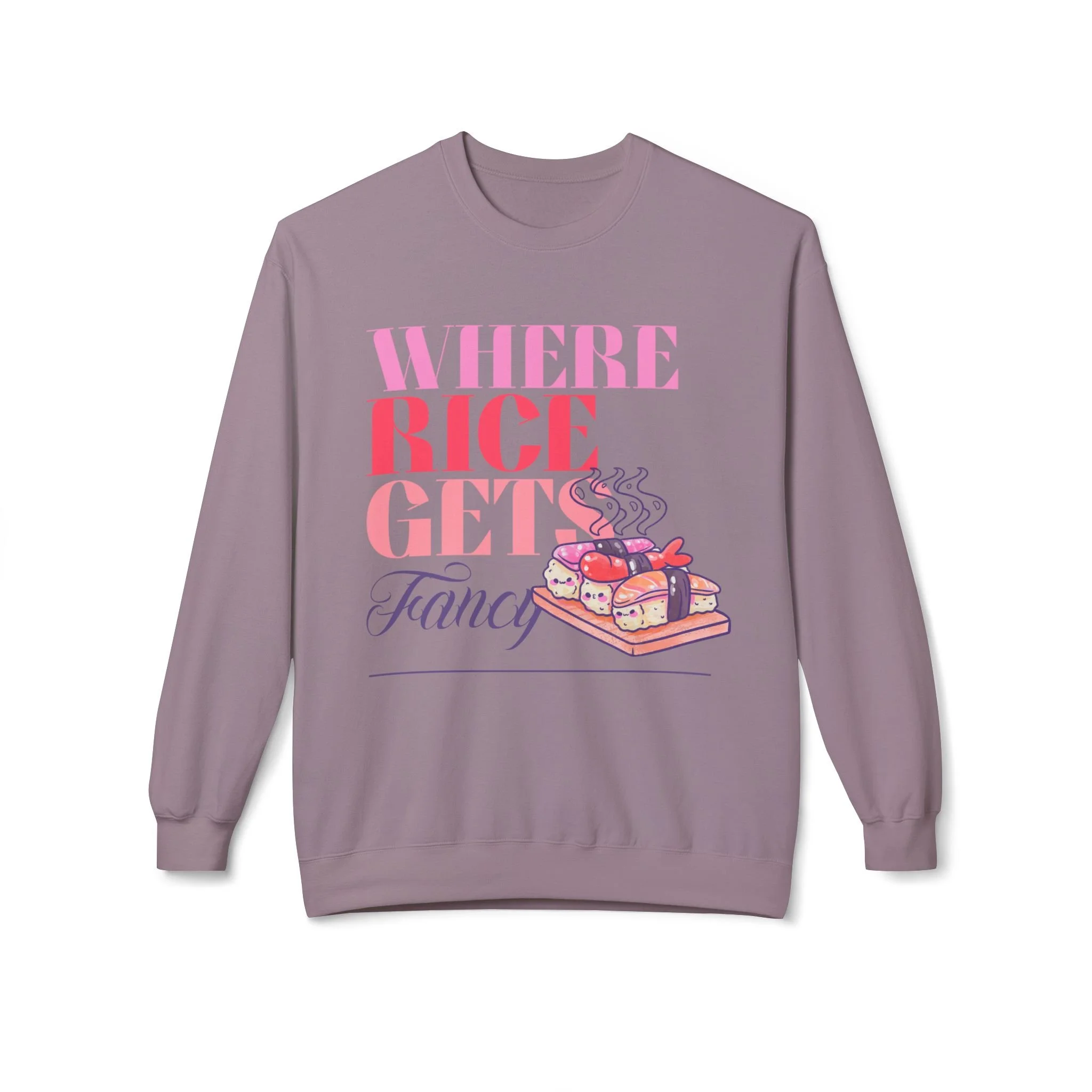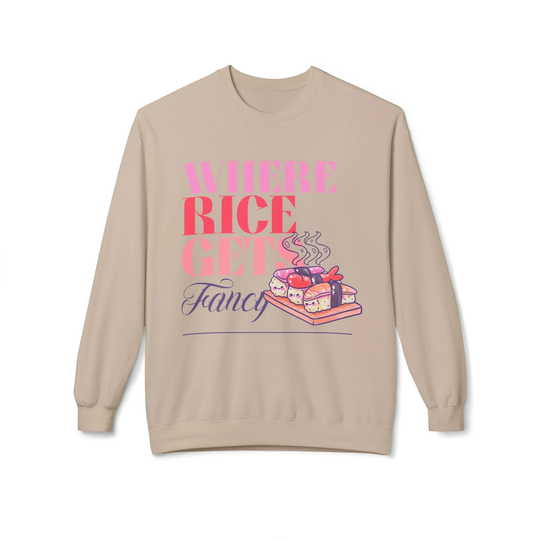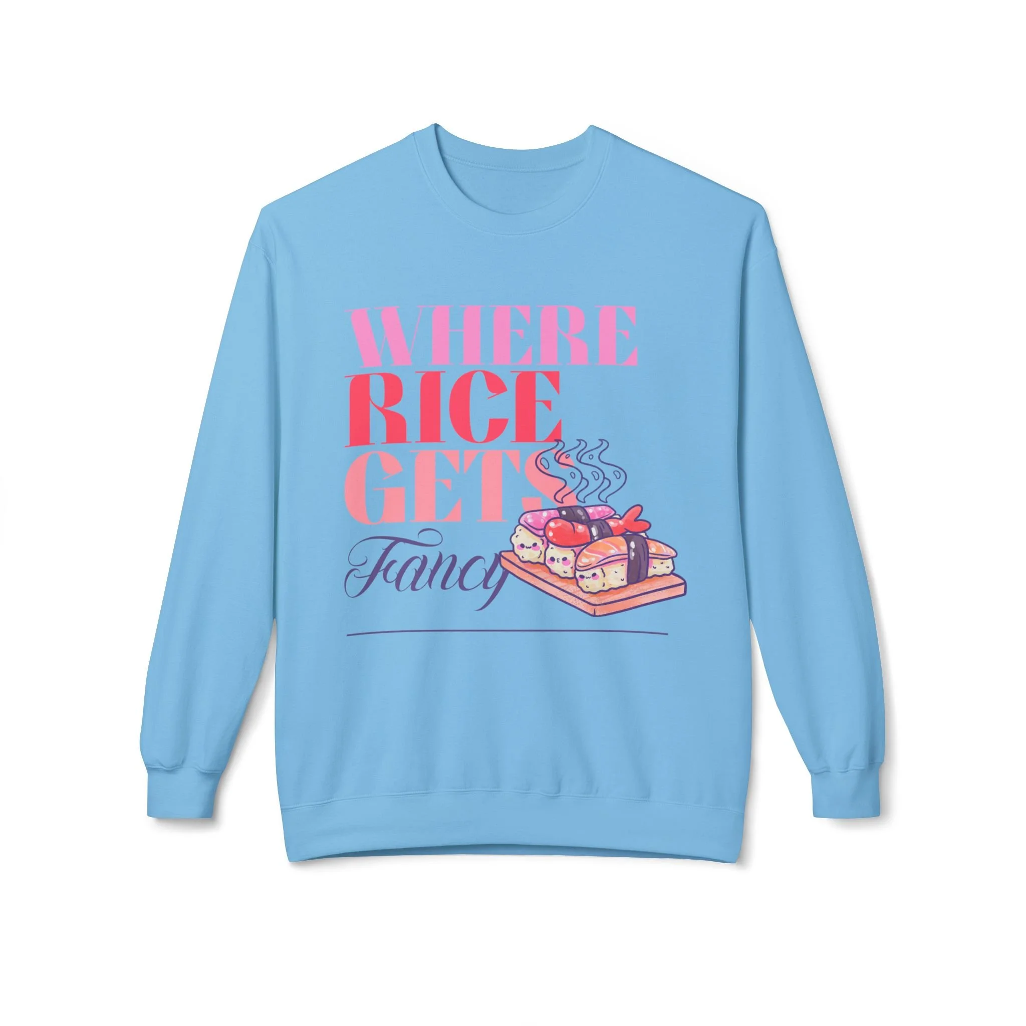 Cute and Happy Sushi on Bamboo Tray - "Where Rice Gets Fancy" Crewneck Sweater