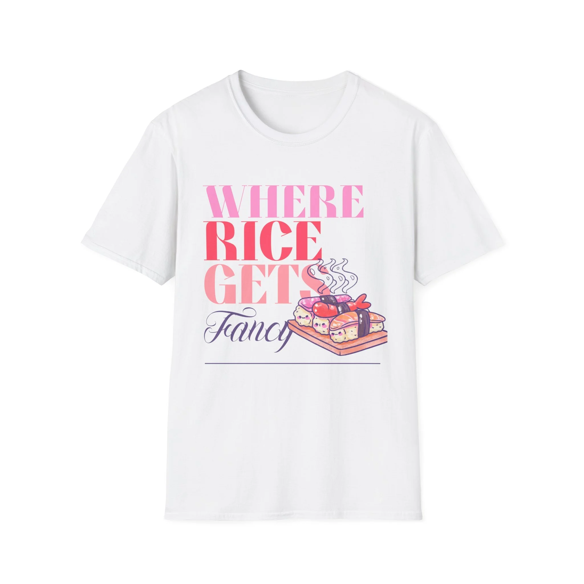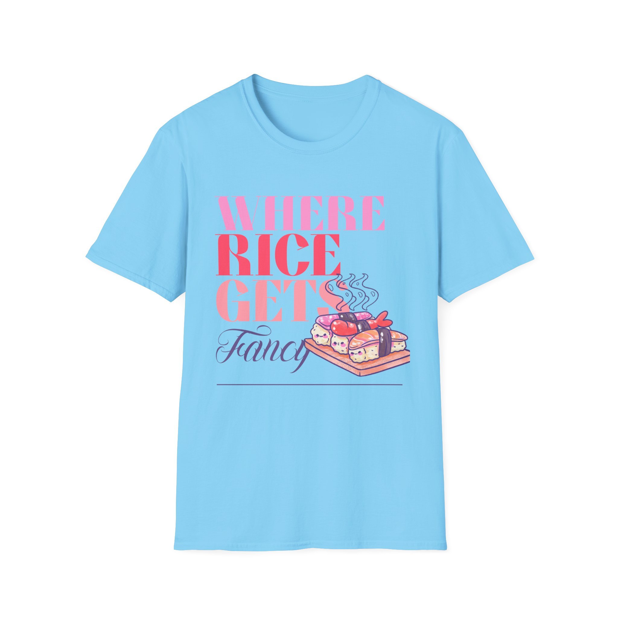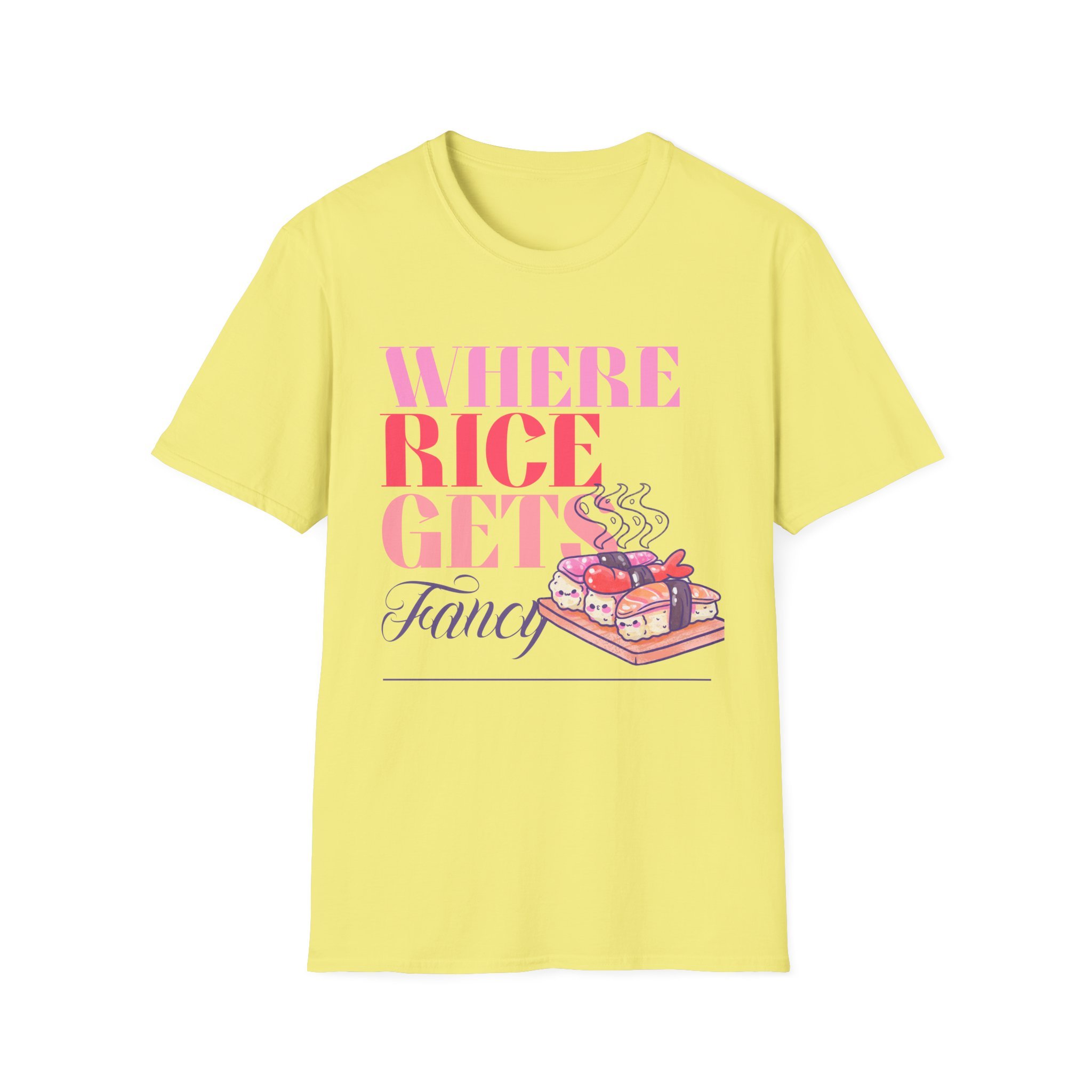 This lightweight cotton tee carries a playful, food-loving spirit — a bright, typographic design reading “WHERE RICE GETS Fancy” paired with a warm, illustrated bento box steaming with sushi and sides. Wear it to bring a little humor and color to everyday errands, food markets, or casual meet-ups with friends. The soft ring-spun cotton sits close to the skin without feeling heavy, while the clean crew neck and classic fit let the graphic take center stage. It’s the kind of shirt that sparks a smile from fellow food fans and becomes a go-to for relaxed days when you want to show off culinary fandom with subtle style.