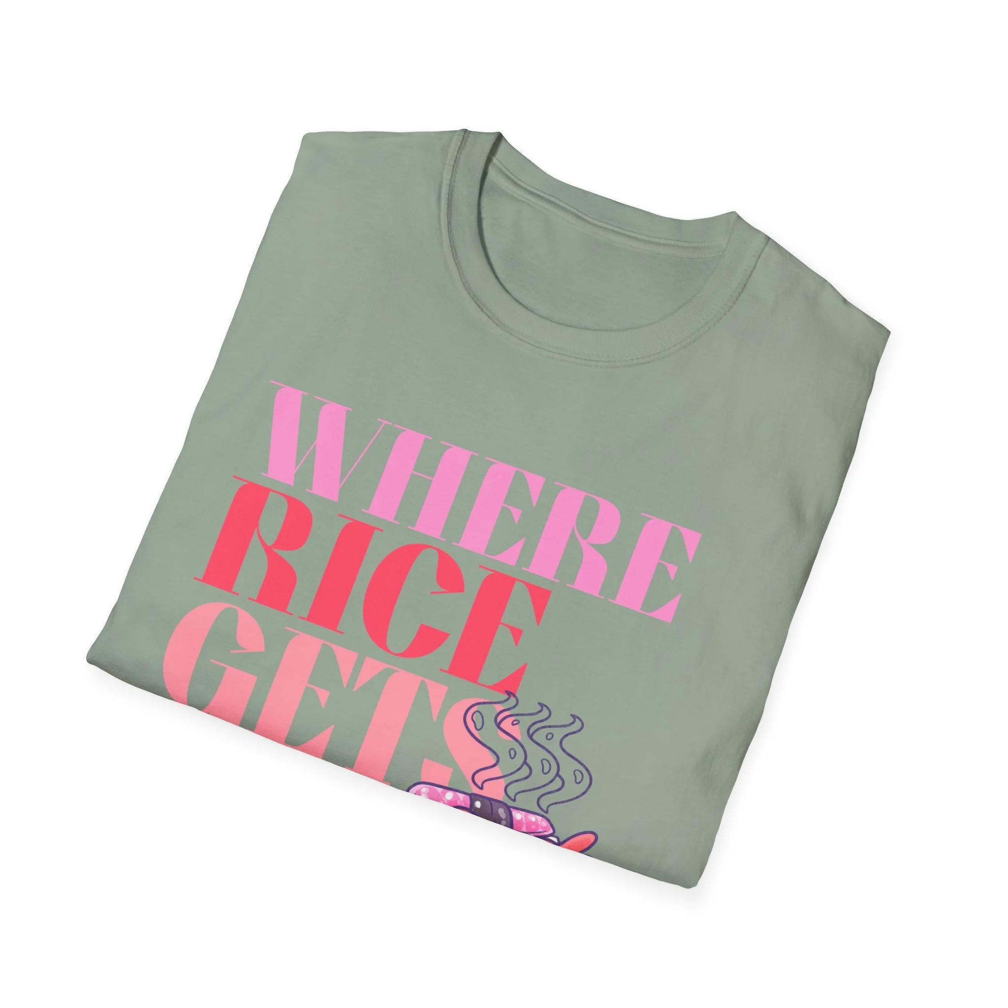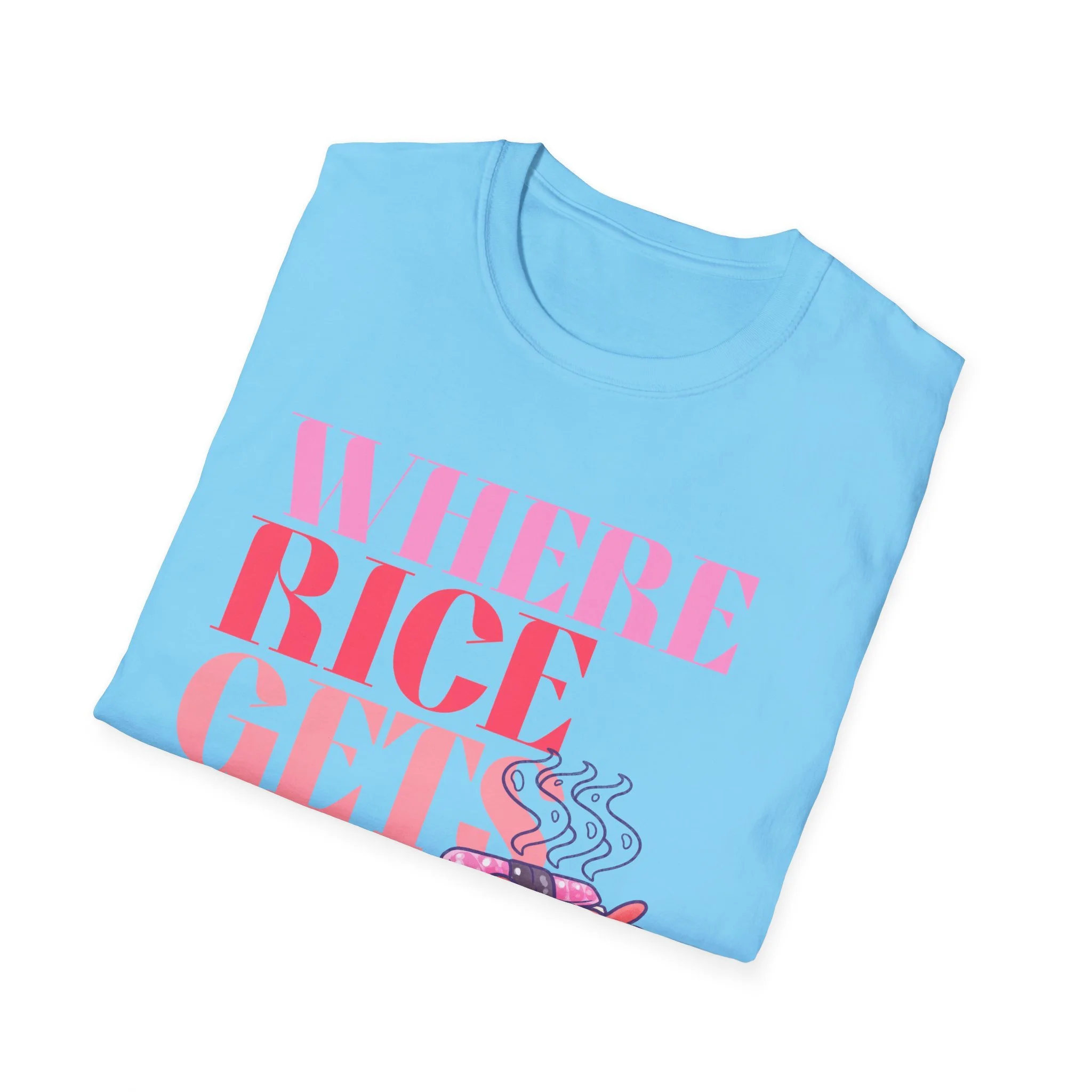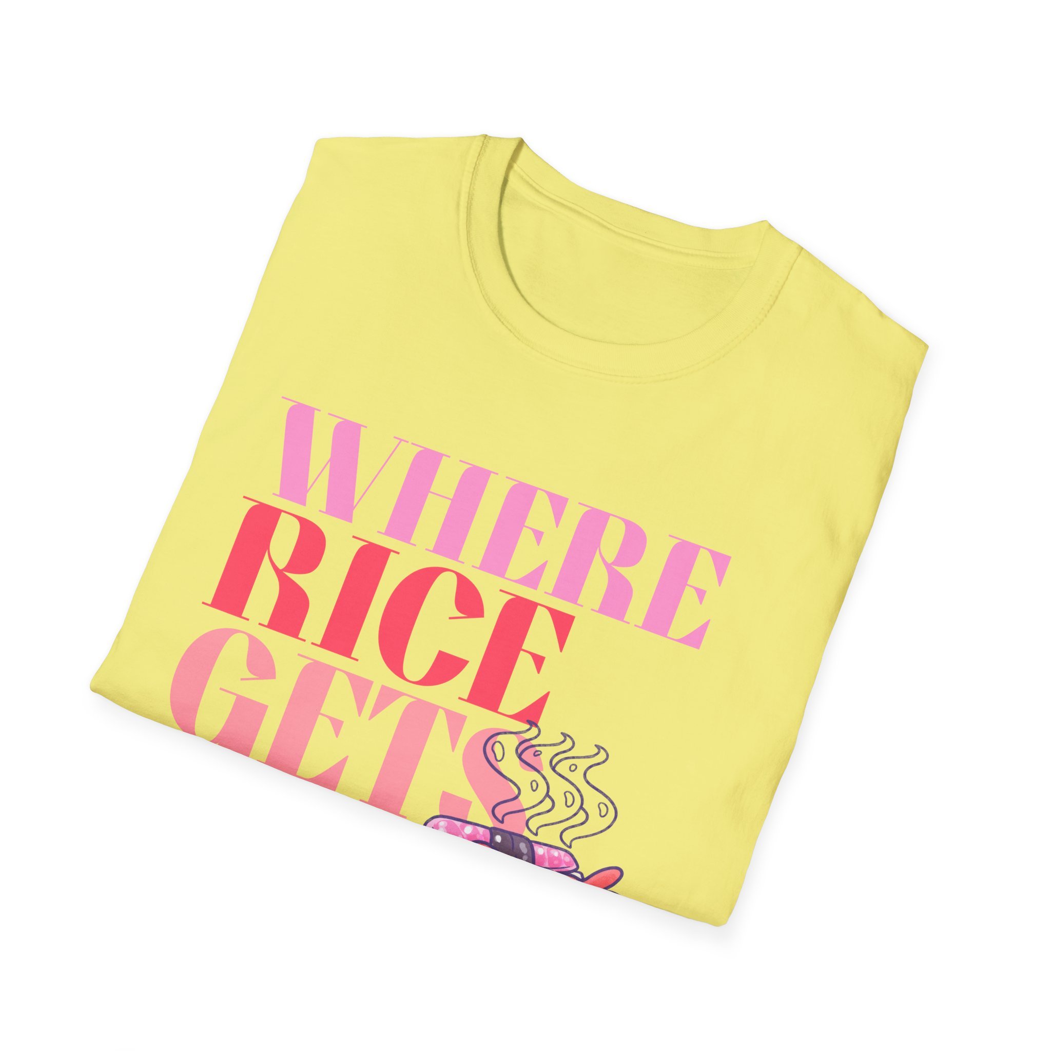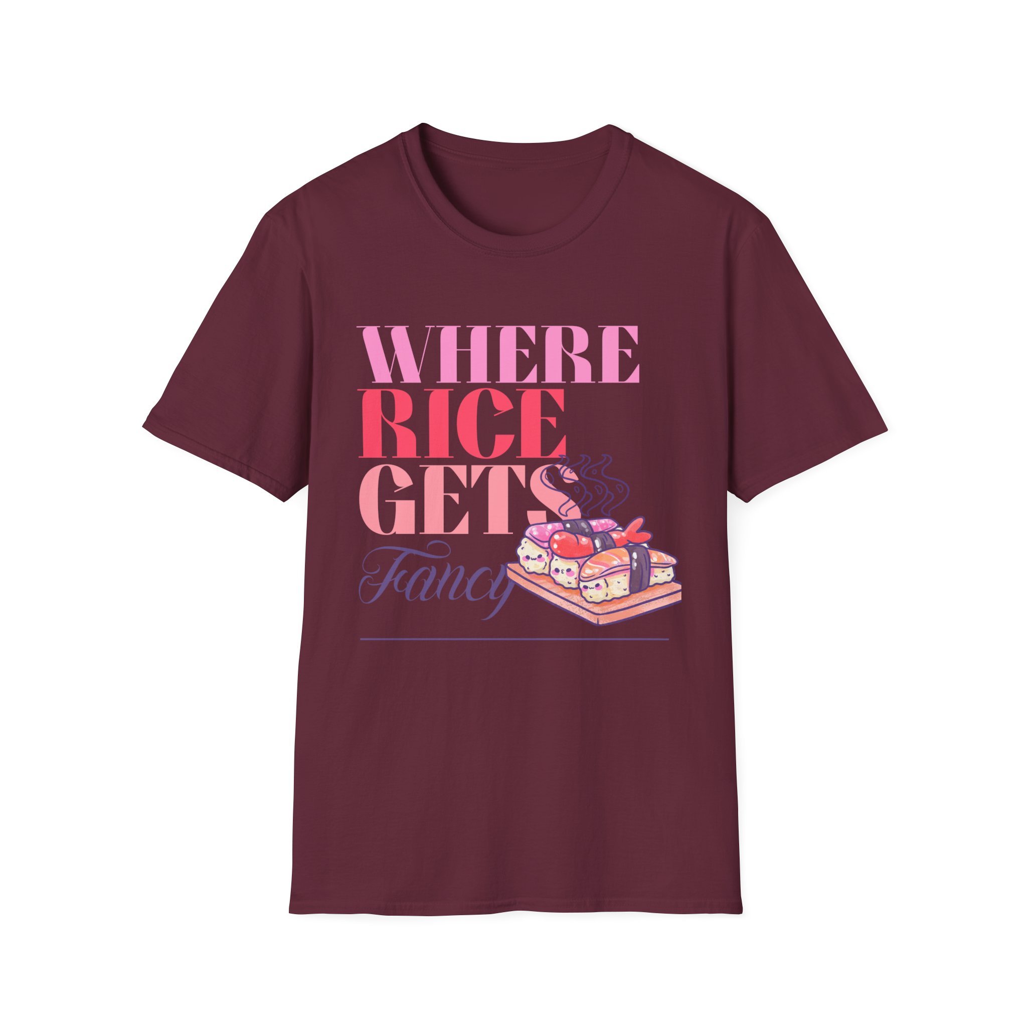 This lightweight cotton tee carries a playful, food-loving spirit — a bright, typographic design reading “WHERE RICE GETS Fancy” paired with a warm, illustrated bento box steaming with sushi and sides. Wear it to bring a little humor and color to everyday errands, food markets, or casual meet-ups with friends. The soft ring-spun cotton sits close to the skin without feeling heavy, while the clean crew neck and classic fit let the graphic take center stage. It’s the kind of shirt that sparks a smile from fellow food fans and becomes a go-to for relaxed days when you want to show off culinary fandom with subtle style.
