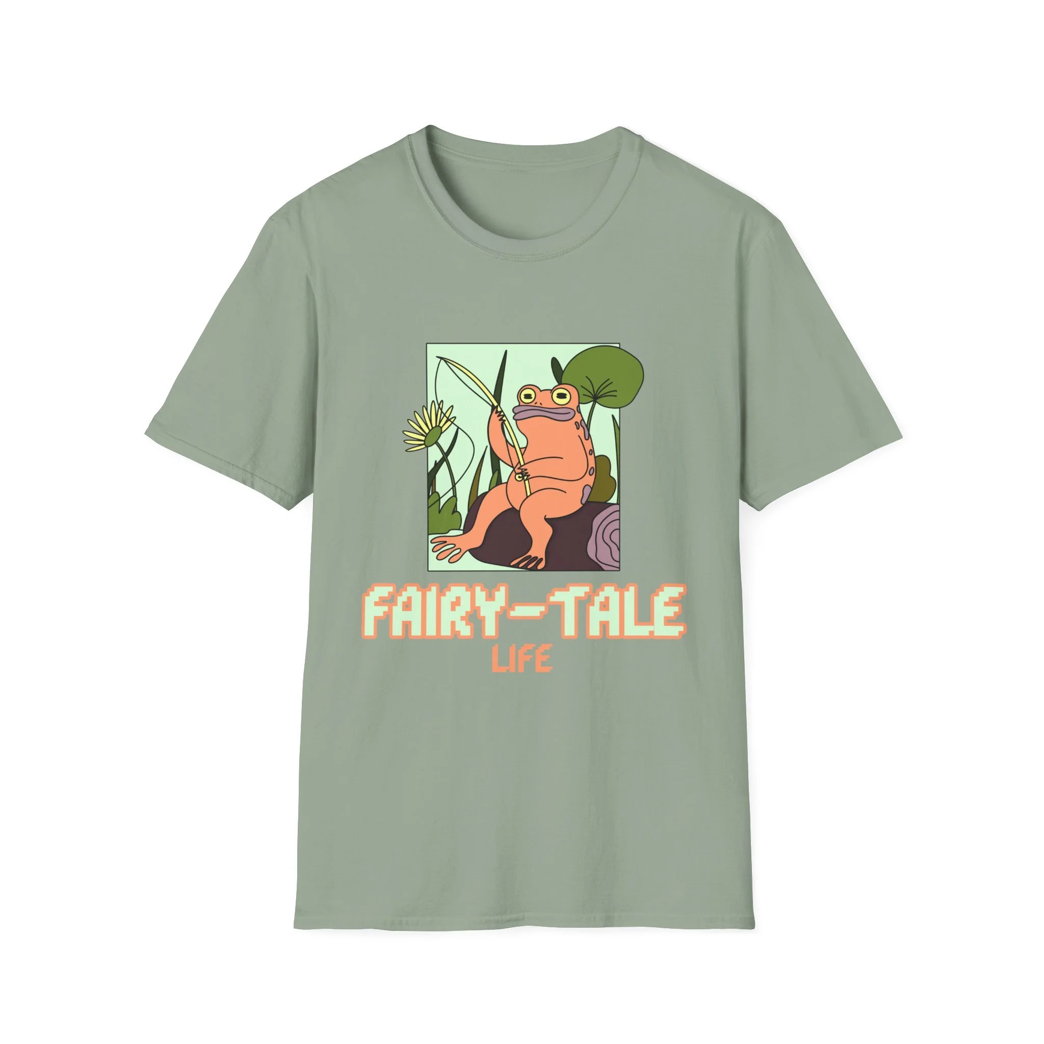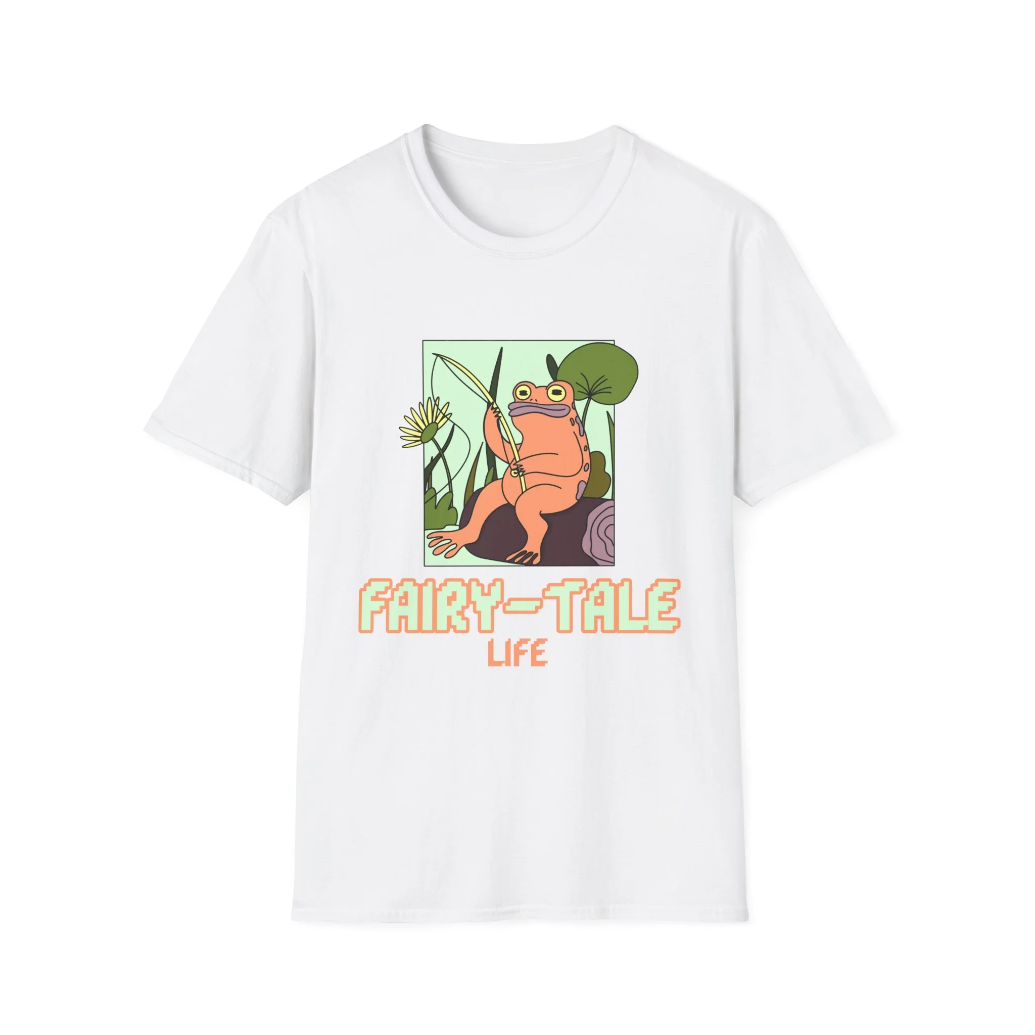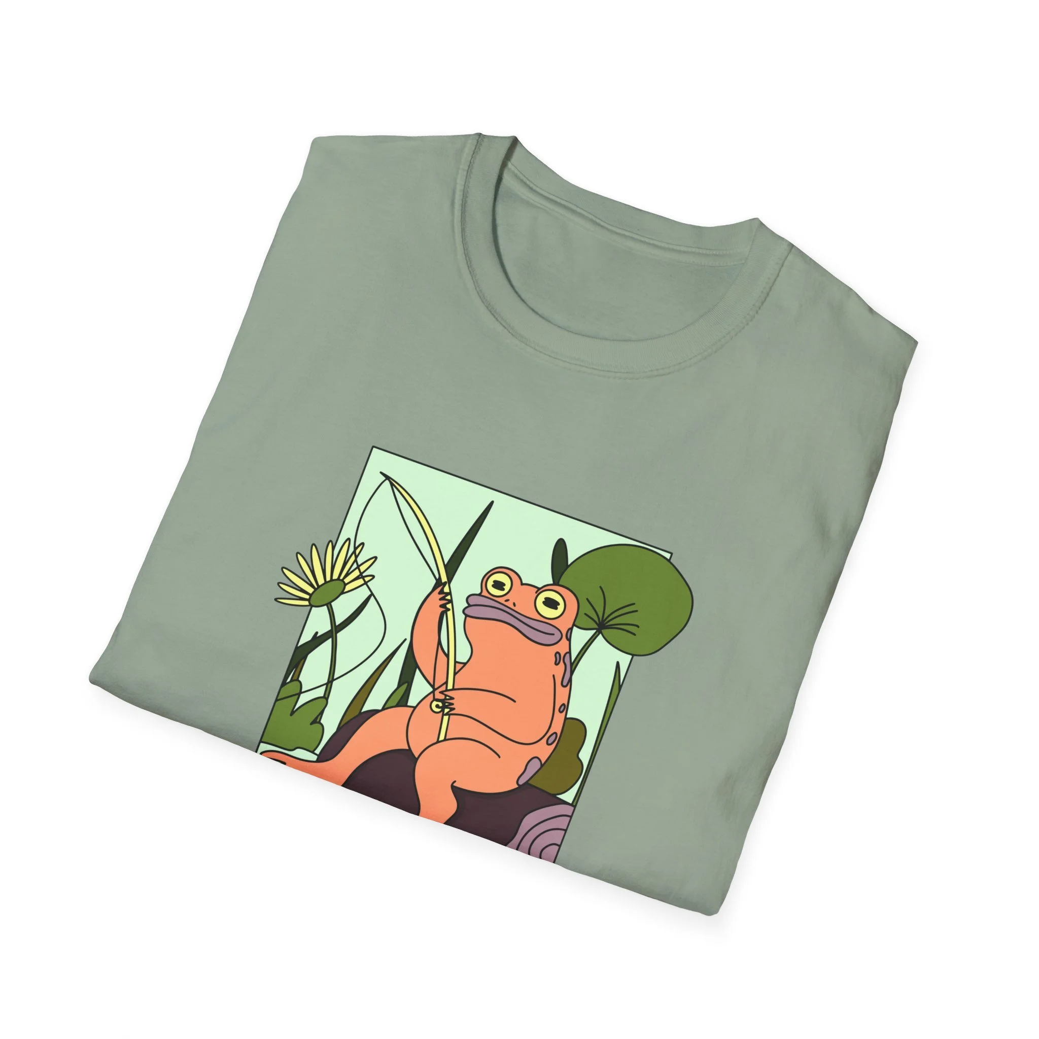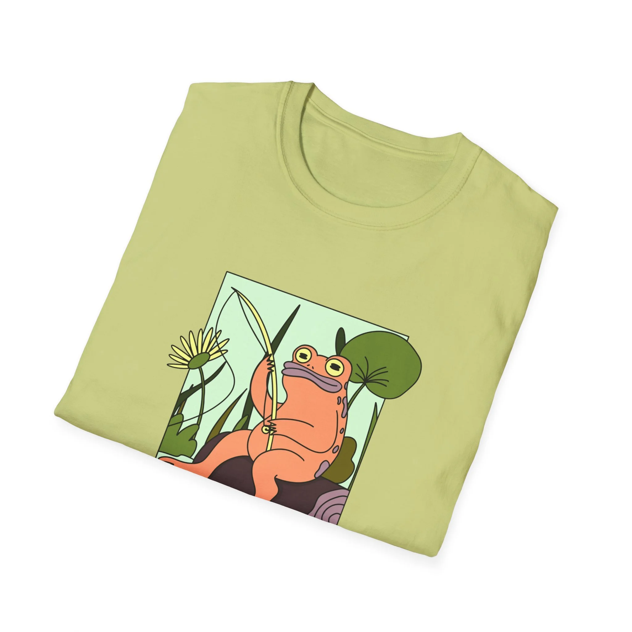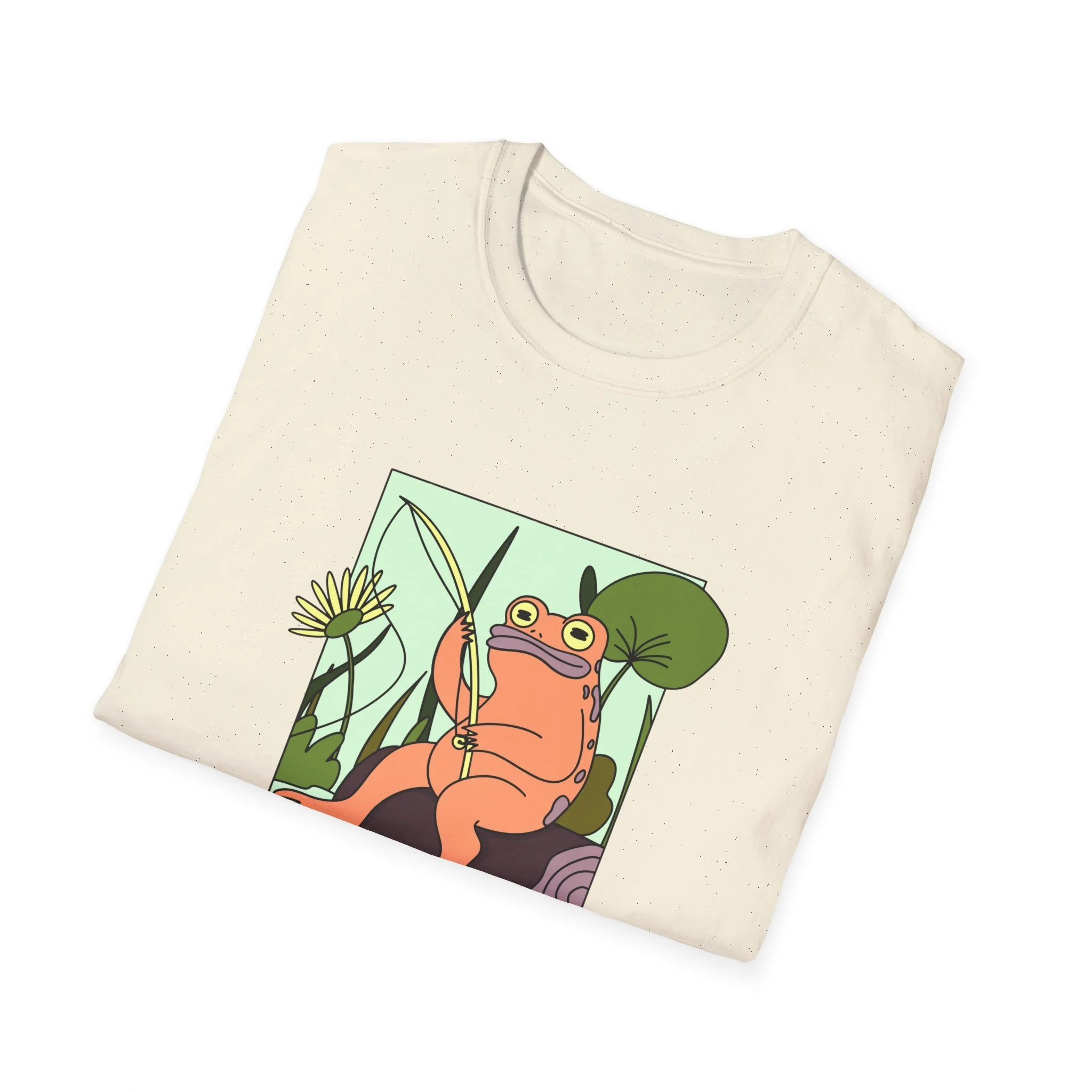 Soft, light, and quietly whimsical — this tee slips into your day like a small, joyful secret. The design features a relaxed frog with a crown of reeds, framed by oversized leaves and rendered in warm pastels. It reads like a snapshot from a storybook stroll by the pond: slow afternoons, sun on your shoulders, and the kind of calm that makes you smile without thinking. Wear it when you want a gentle, playful note in your outfit — with denim for wandering afternoons, layered under a cardigan for cozy evenings, or as a relaxed staple at casual meetups. The simple crew neckline and classic cut keep the focus on the illustration, letting the art and colors do the talking.
