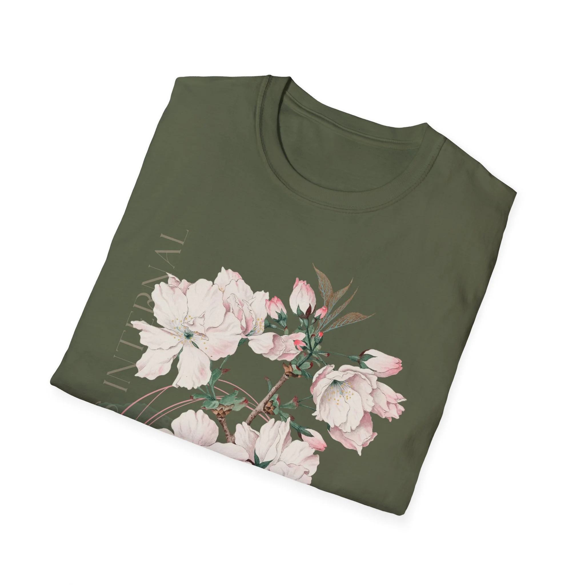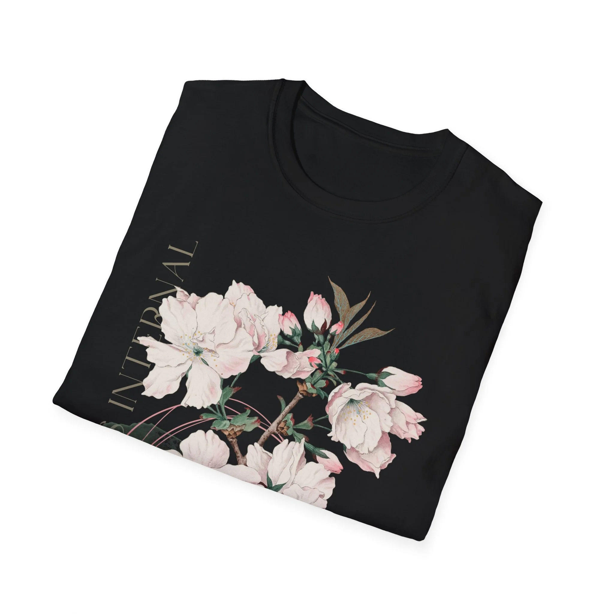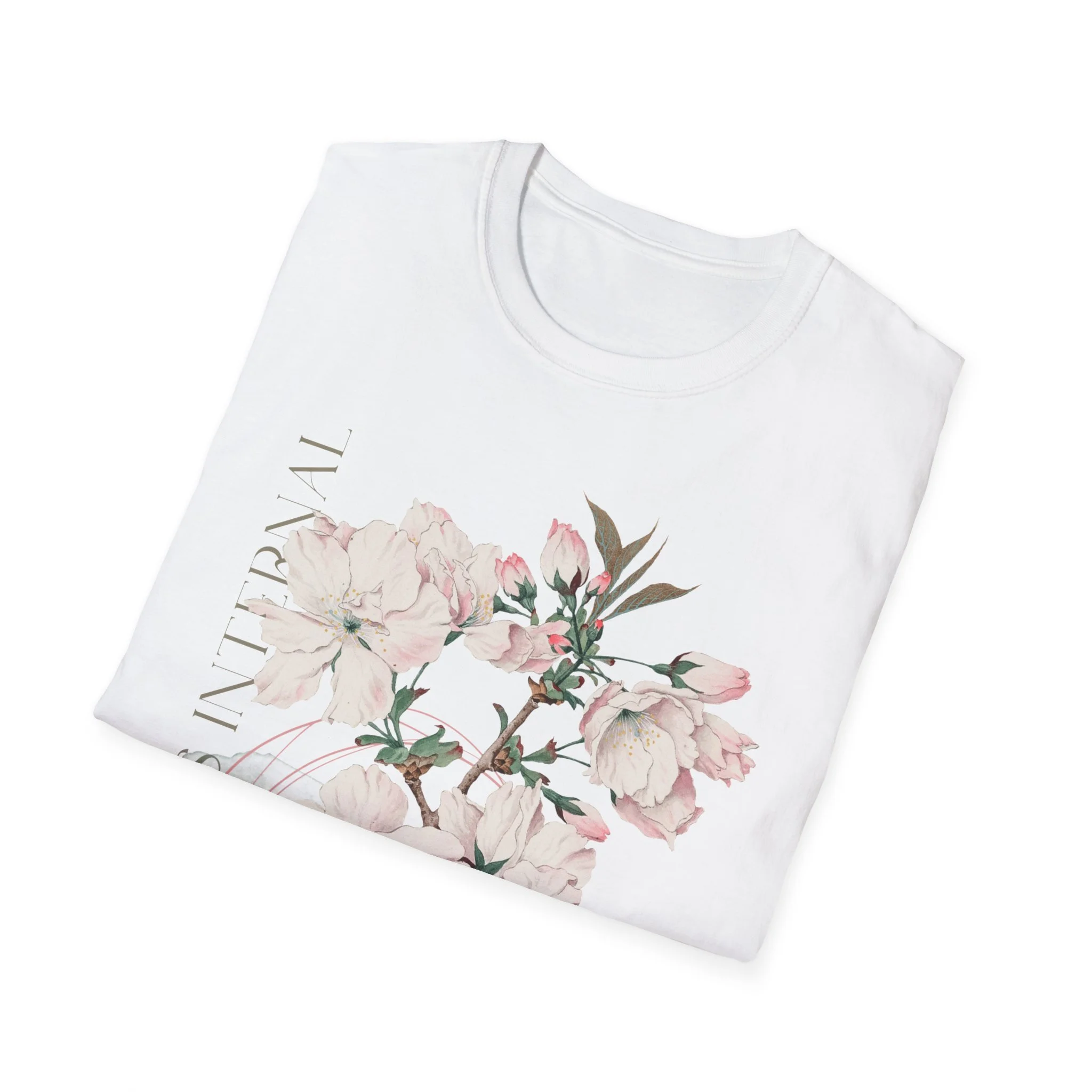 A lightweight cotton tee printed with a soft, painterly floral motif that reads like a quiet breath of spring. The design blends pale pink blossoms and delicate leaves with subtle typographic accents, giving the shirt a calm, artful look that slips easily into everyday wear. Wear it on cool mornings with a knit cardigan, or layered under a blazer for a gentle contrast at casual gatherings. The fabric feels smooth against skin and drapes cleanly, so the artwork stays the focal point without shouting for attention. This shirt is for people who favor understated beauty and gentle color palettes — those who notice the small details and carry a restful kind of style.