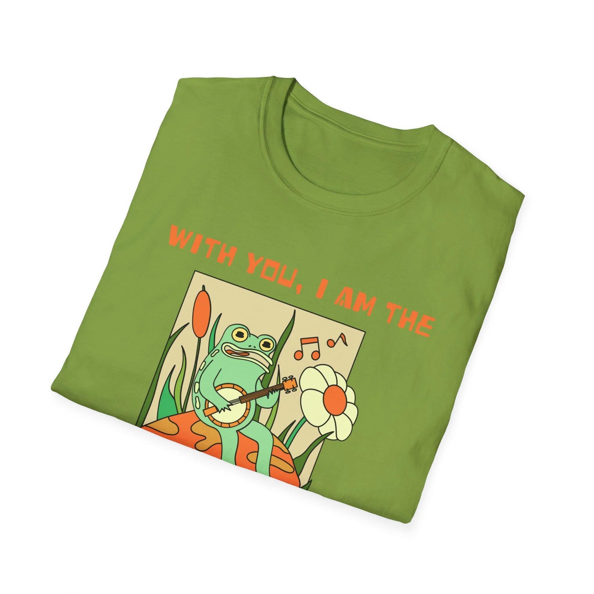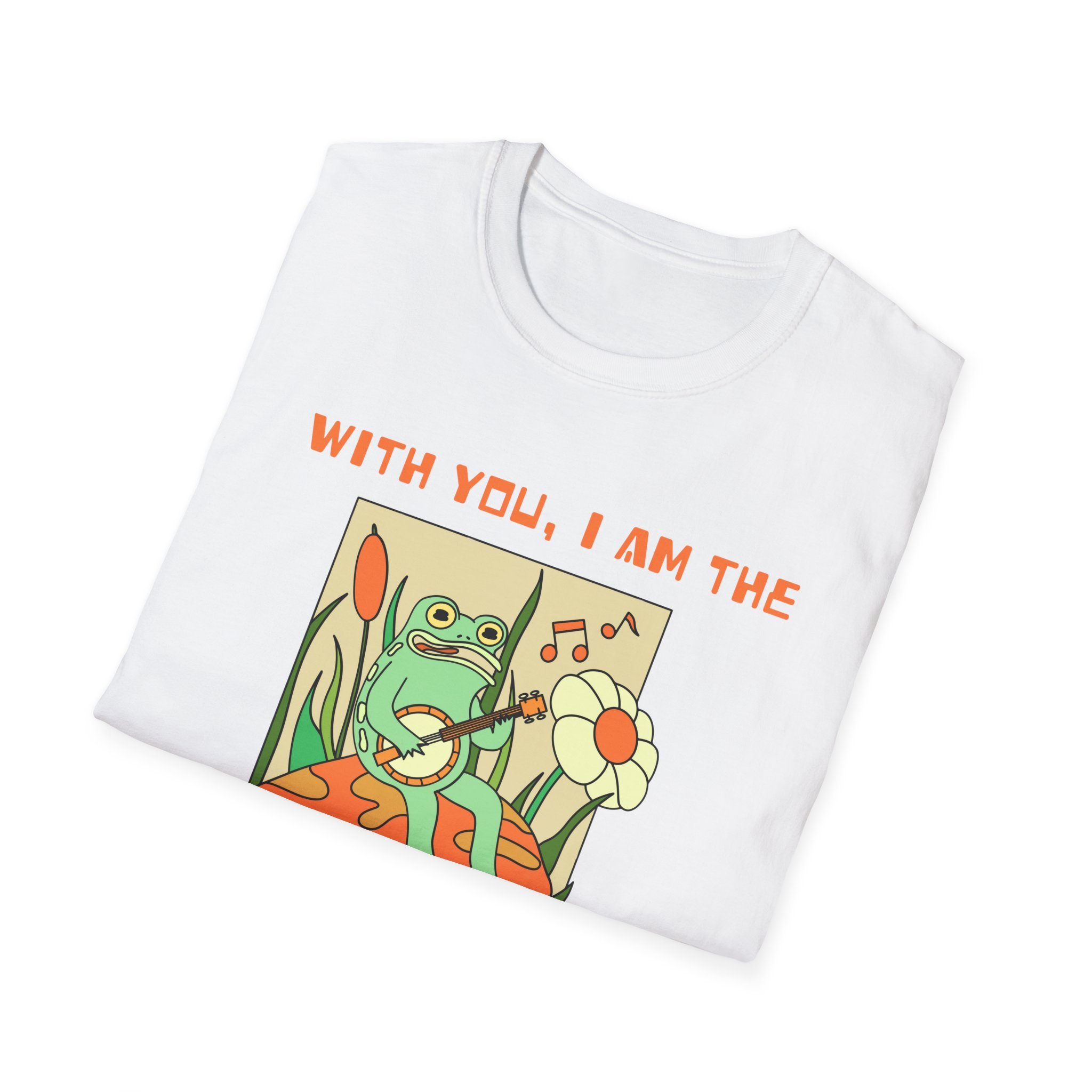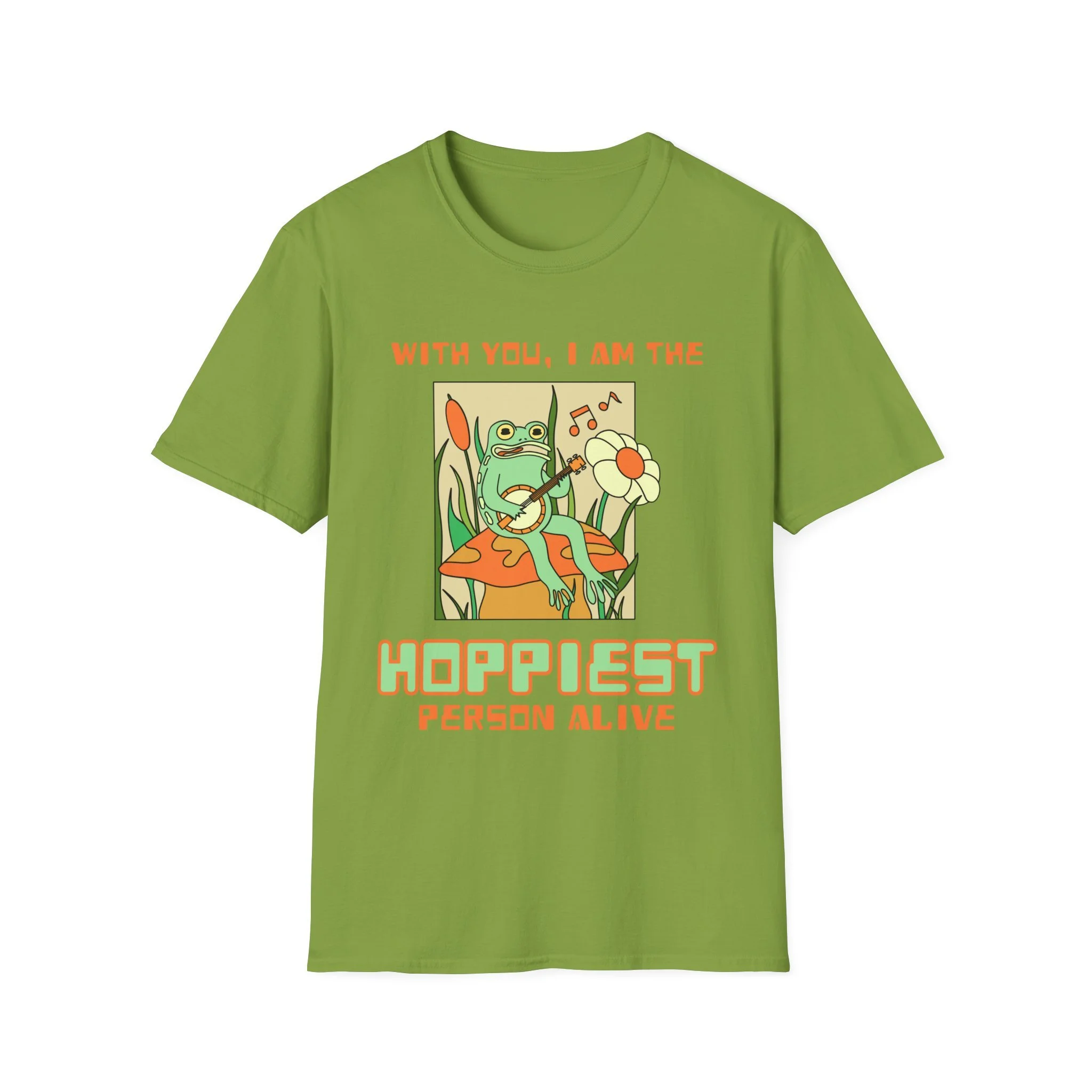 Soft, sunny, and a little bit silly — this lightweight tee carries a calm, retro vibe that feels like a slow afternoon spent with someone who makes you laugh. The front art shows a relaxed frog lounging on a mushroom, holding a daisy and a record; the caption reads “With you, I am the hoppiest person alive.” Wear it when you want to send quiet joy into the room — casual enough for everyday, charming enough to spark conversations at a coffee shop, a park meetup, or a laid-back spring gathering.