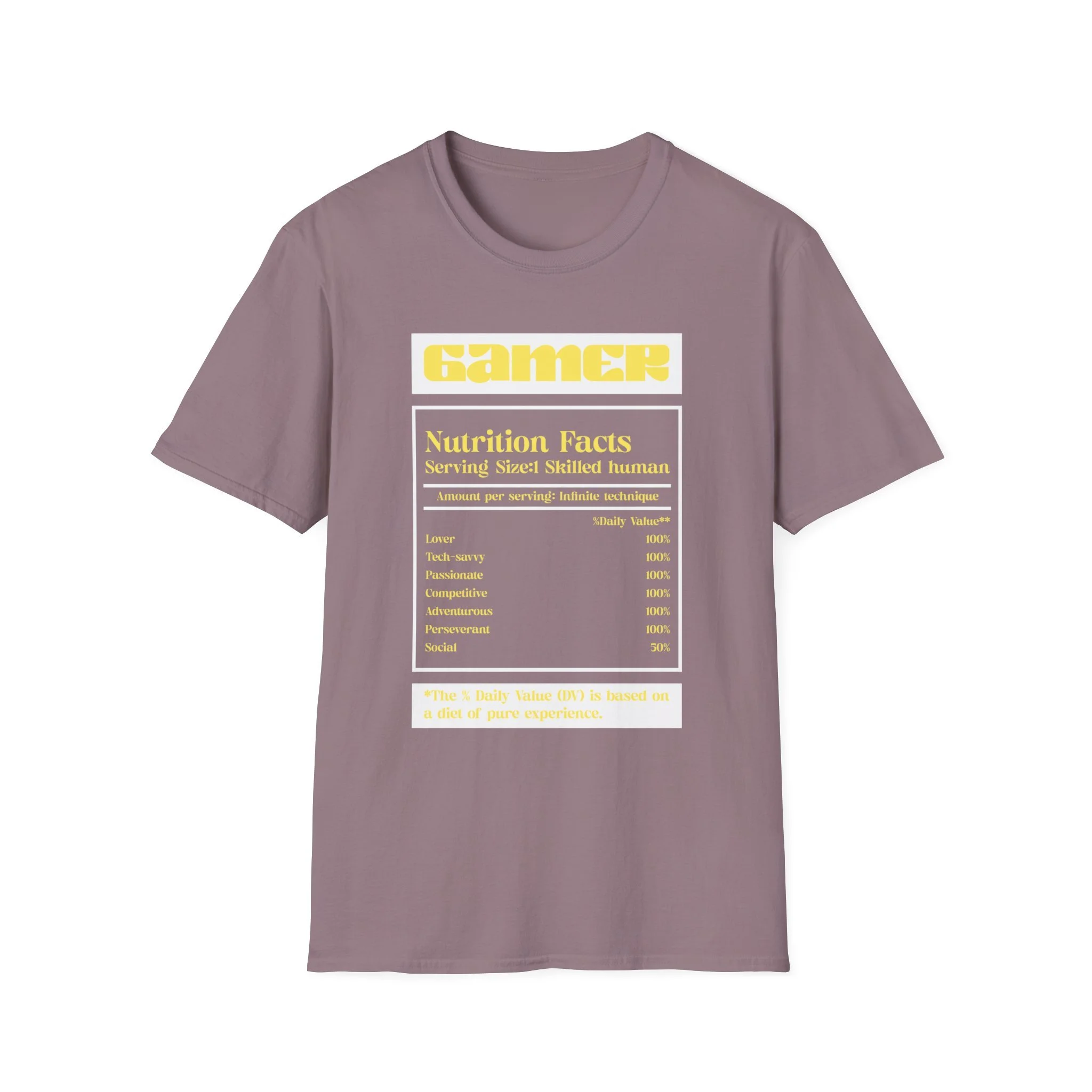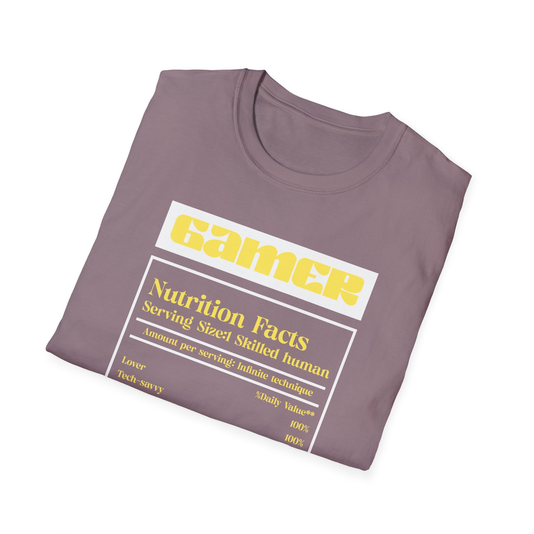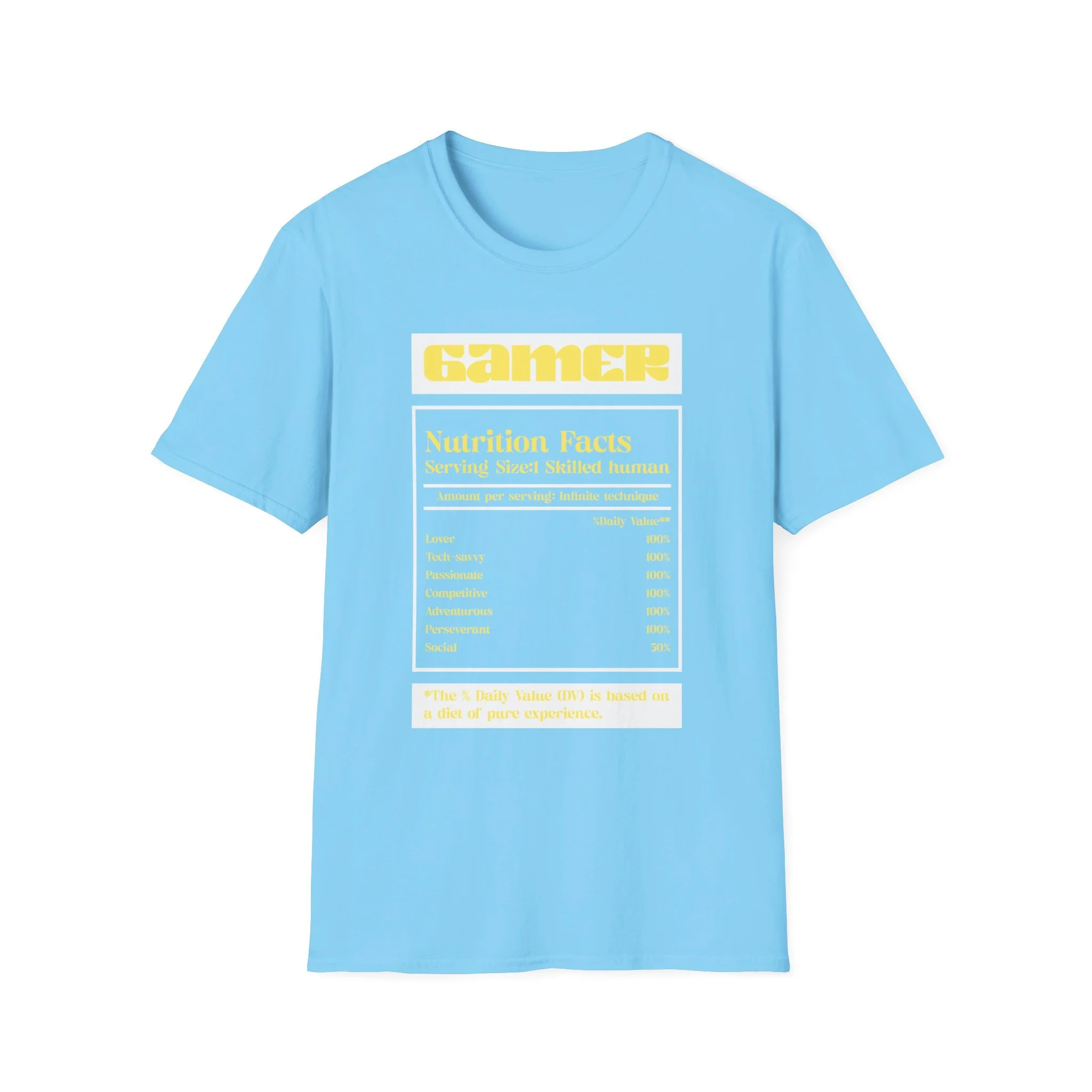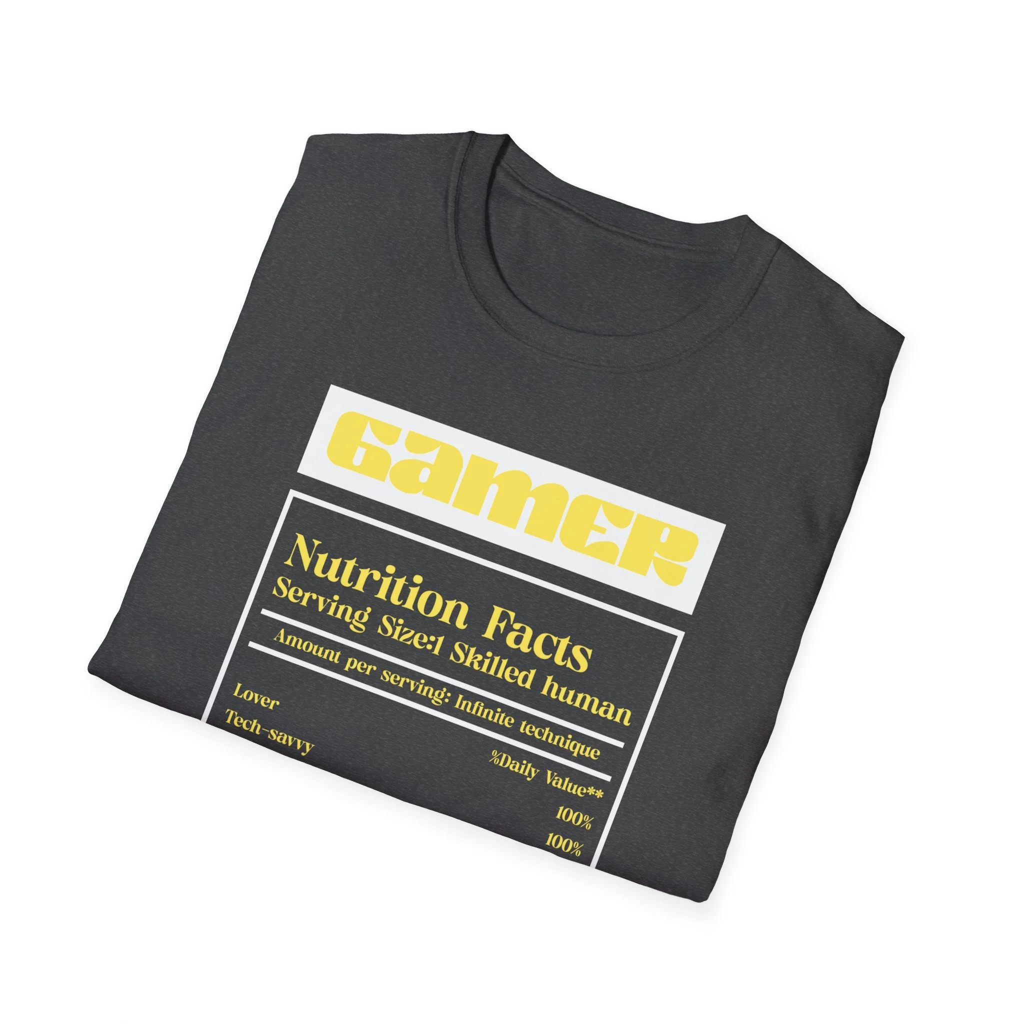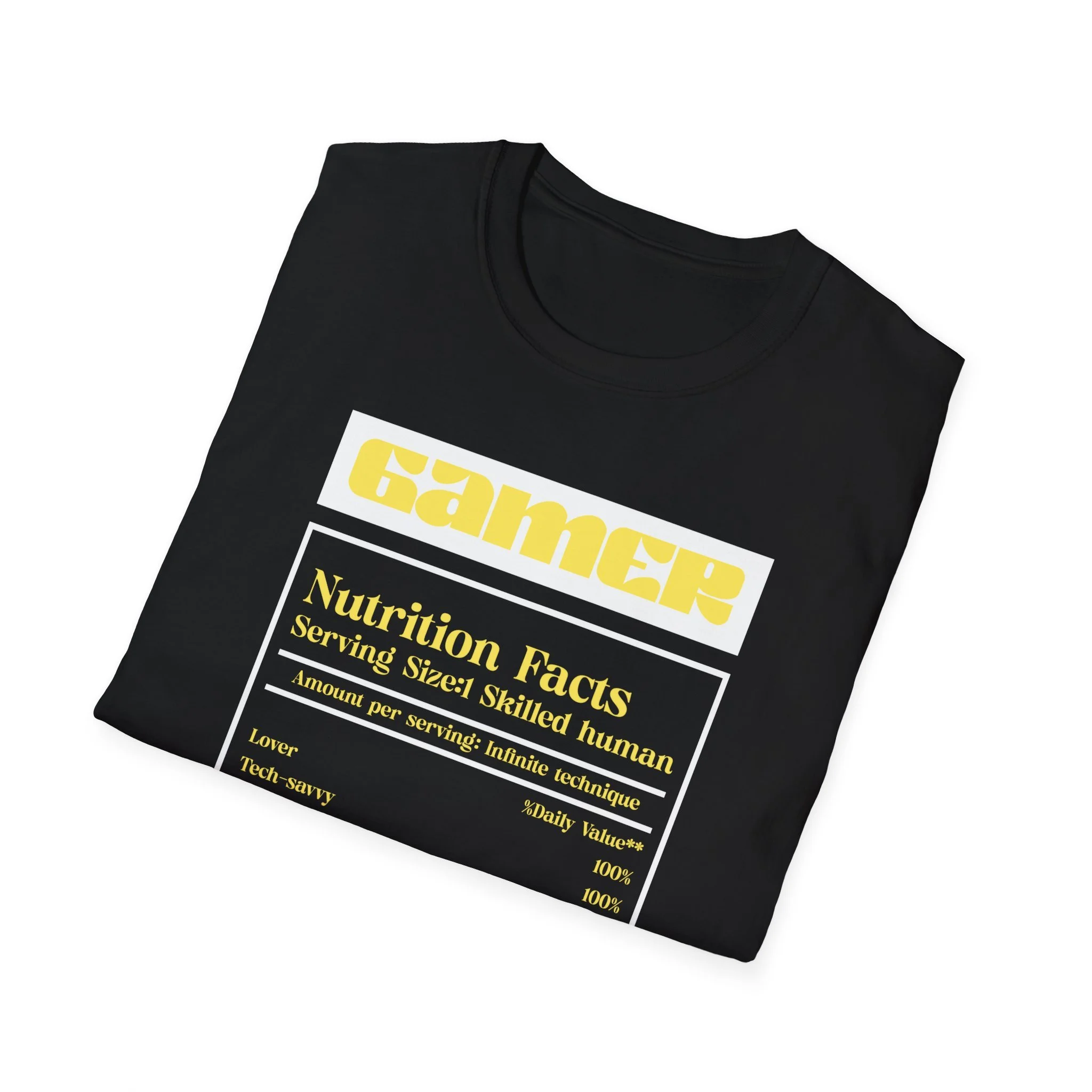 A soft, lightweight tee that wears like a second skin and shows off gamer pride with subtle, clever style. The front features a nutrition-label-inspired graphic in high-contrast yellow and white on black — a tongue-in-cheek breakdown of the traits that make a skilled gamer. The shirt’s smooth ring-spun cotton feels breathable and easy to layer. It keeps its shape thanks to ribbed neckline and shoulder tape, and the tear-away label removes irritation for long sessions. Wear it to streams, local LANs, or casual days out when you want your personality on display without shouting for attention.