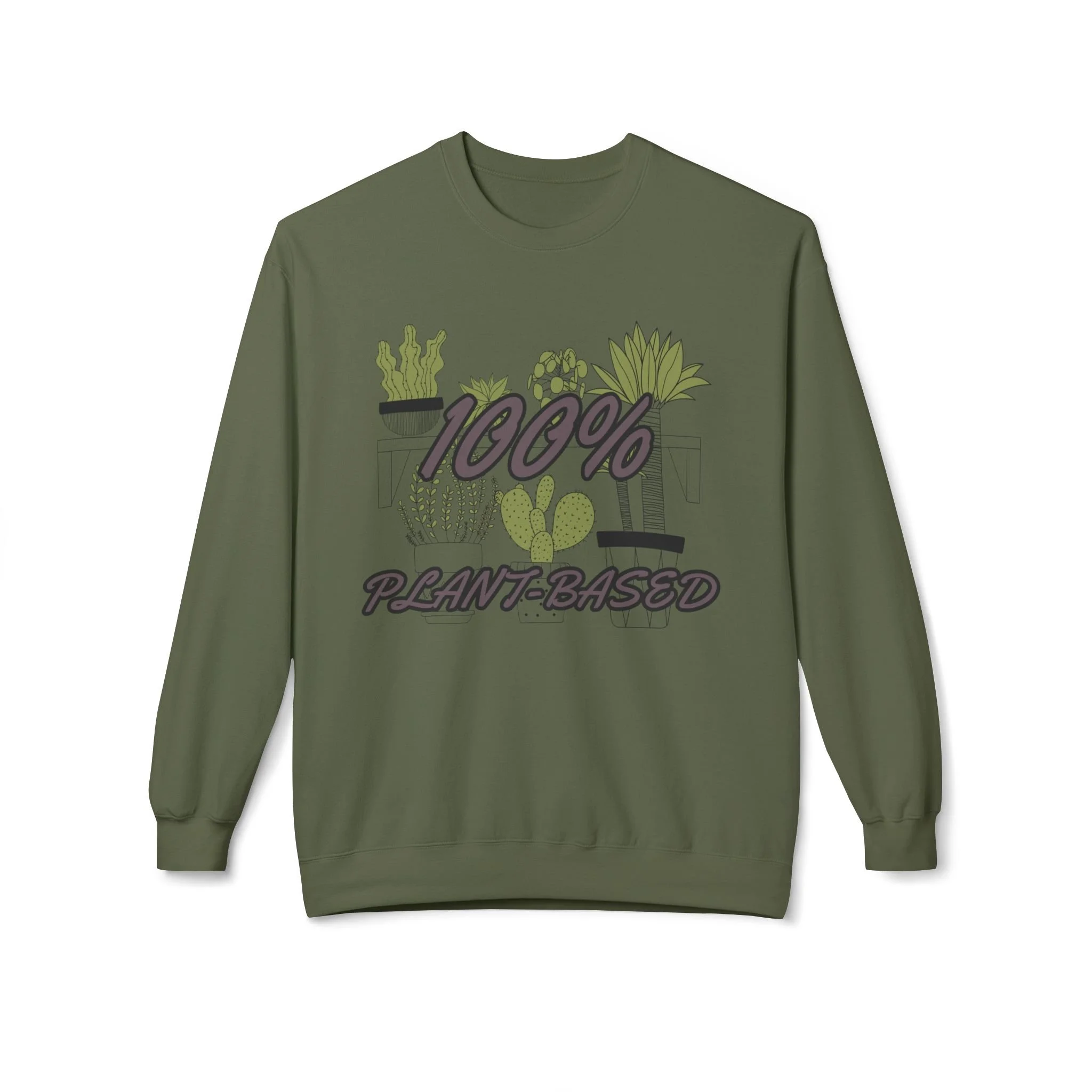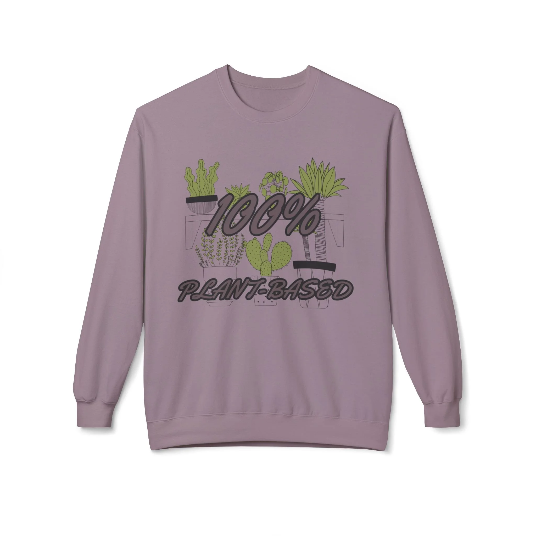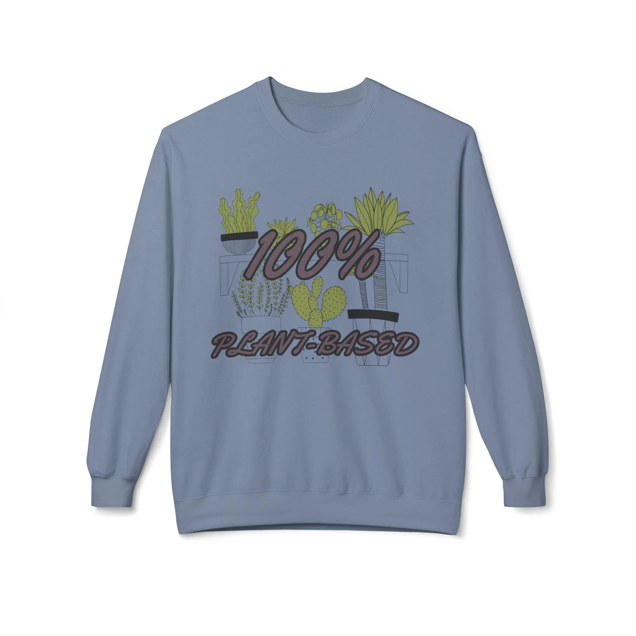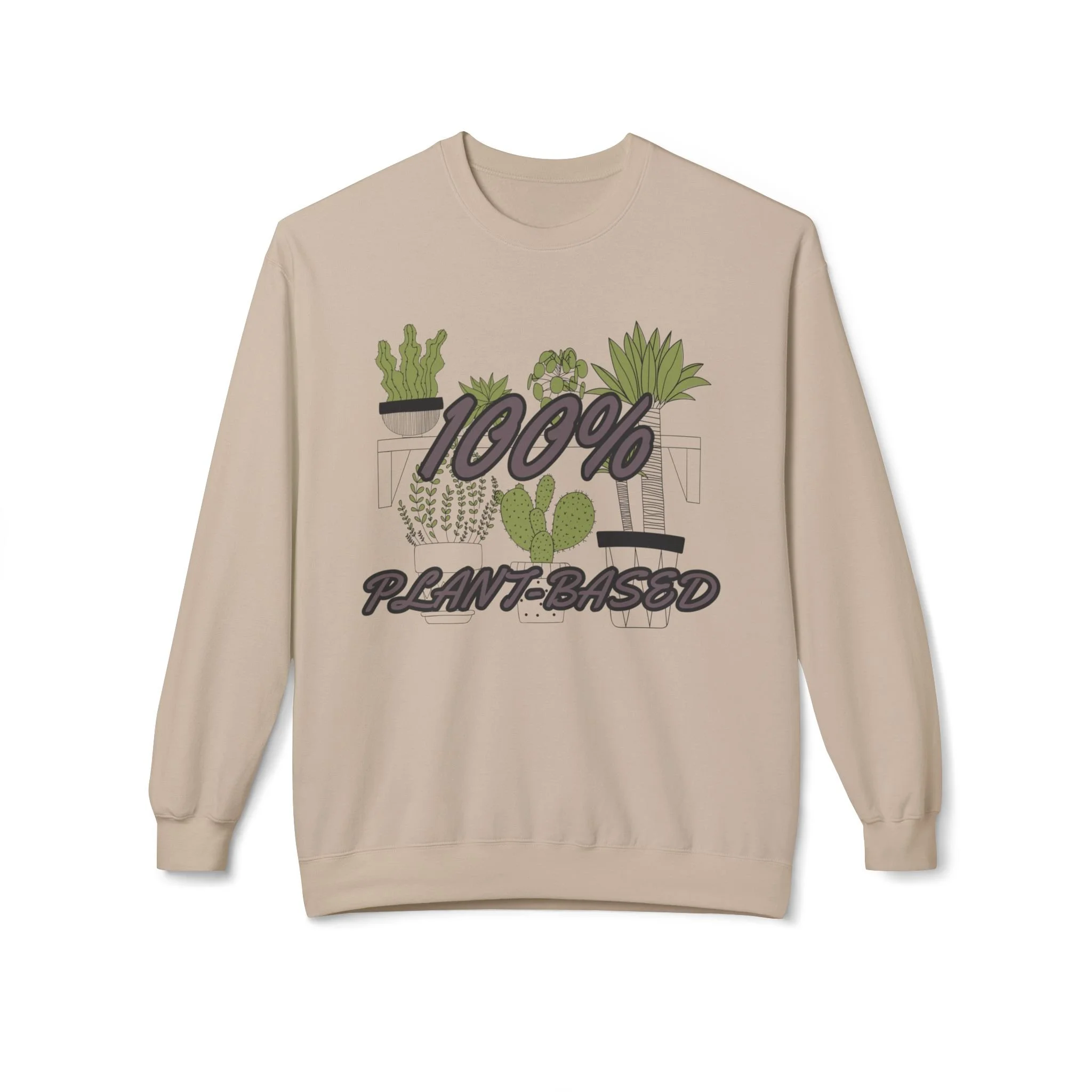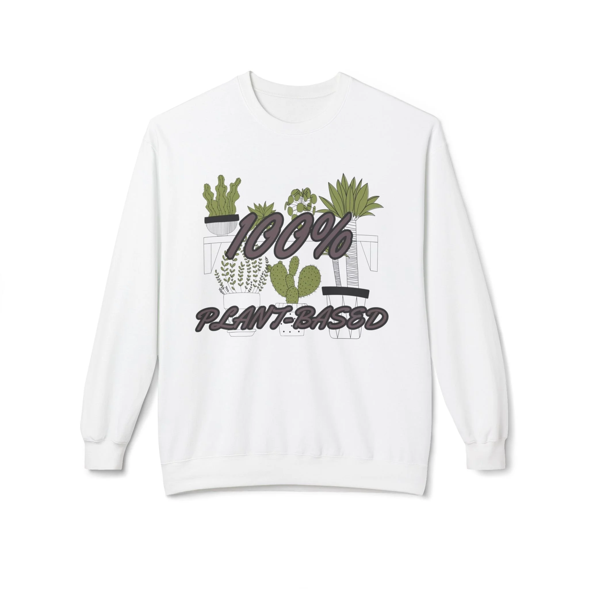 Soft, cozy, and quietly expressive — this midweight crewneck wraps you in warmth while shouting your plant-lover pride in a gentle, stylish way. The front artwork layers hand-drawn succulents and leafy pots behind bold "100% Plant-Based" lettering, creating a casual, lived-in look that reads like a favorite patch of sunlight on the windowsill. Dropped shoulders and a classic fit make it easy to slip on after a weekend at the nursery or while tending to your indoor jungle. Wear it to slow mornings with a mug, plant swaps with friends, or brisk walks through the farmer’s market — it feels lived-in from the first wear and holds shape wash after wash.